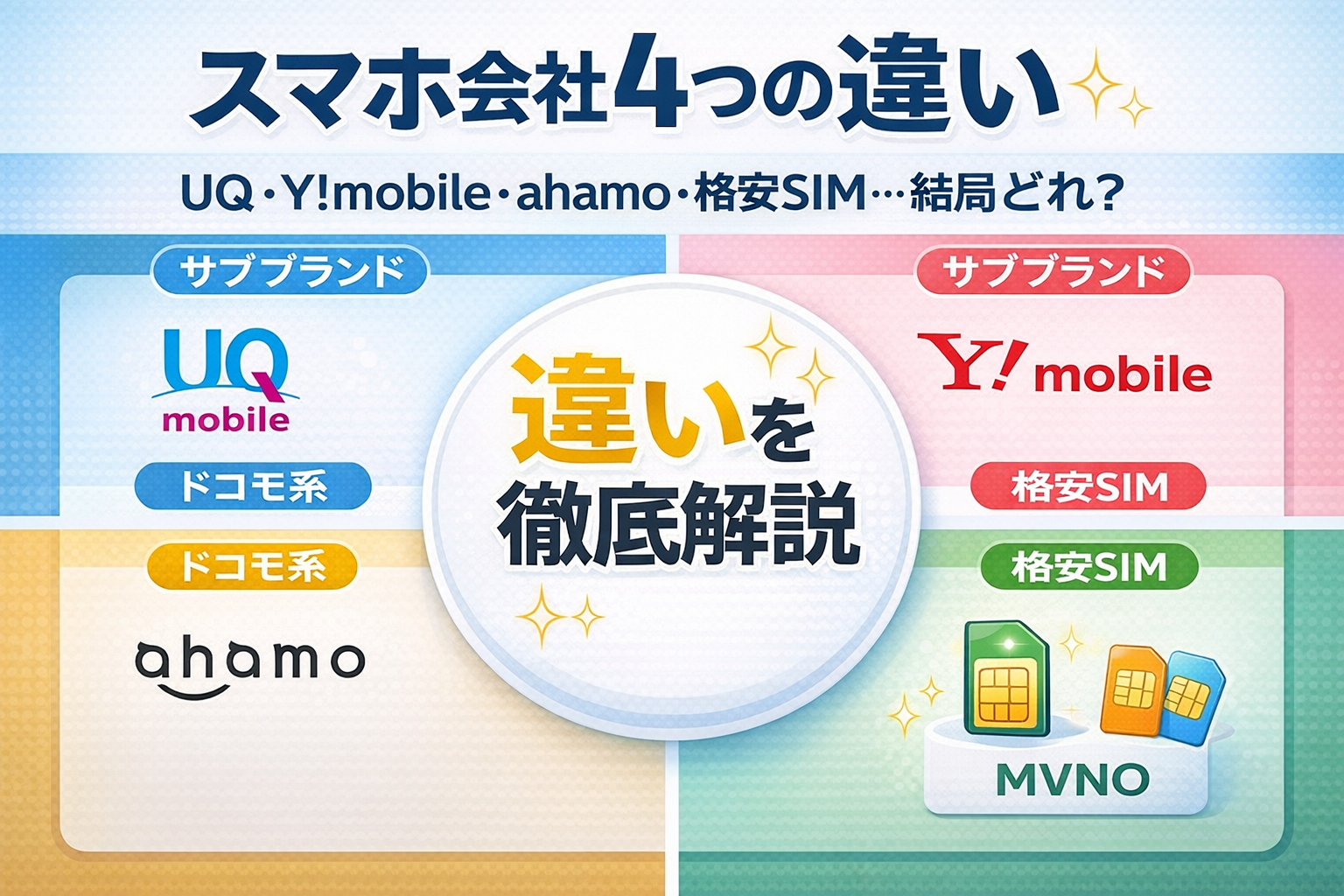 スマホ料金を安くしようと調べていると、ahamoやUQモバイル、日本通信SIMなど、似たような名前が次々と出てきて「結局、何が違うの?」「自分はどれを選べば正解?」と迷ってしまいますよね。